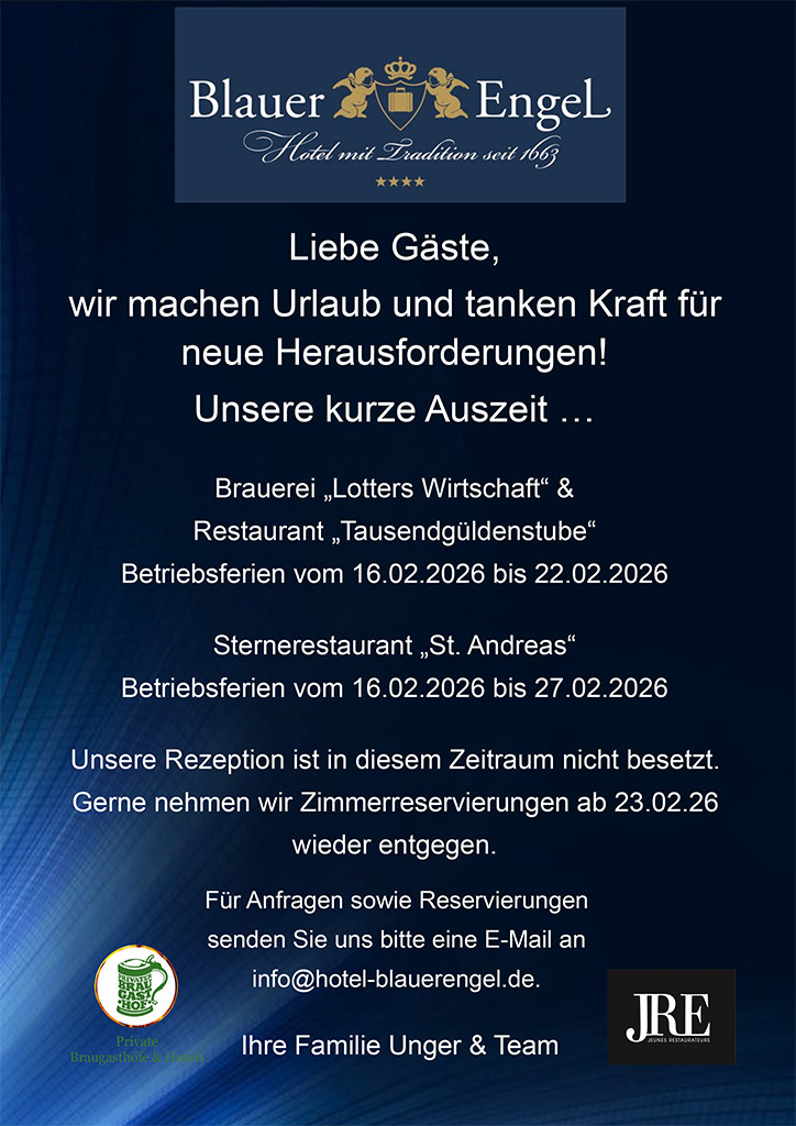 Herzliche Gastfreundschaft und familiäre Atmosphäre erwartet Sie in unserem Haus.Genießen Sie deftige Hausmannskost, bierige Spezialitäten oder unsere Spezialitätenküche in unserem Feinschmeckerrestaurant St. Andreas